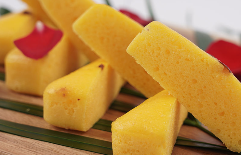 第九步:取出后切成小塊即可食用了,金黃色的軟蛋糕,香氣迎面撲來啊~