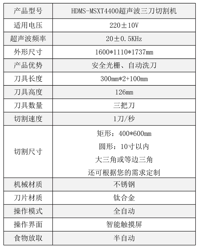 該設備配備單把超聲波刀片,可切圓形(只限一個圓蛋糕),也可切方形 |