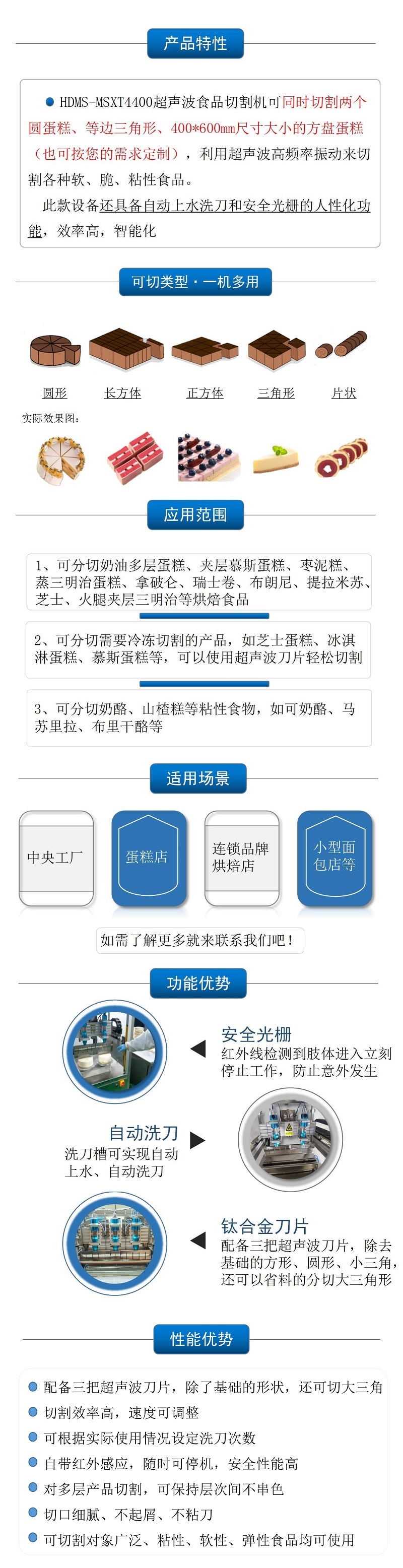 該設備配備雙把超聲波刀片,既可切方蛋糕,也可同時切兩個圓蛋糕,還具有自動上水洗刀、安全光柵的人性化功能,效率高,更方便 |