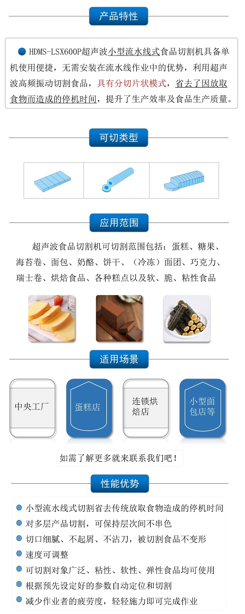 該設(shè)備配備單把超聲波刀片,可切圓形(只限一個(gè)圓蛋糕),也可切方形