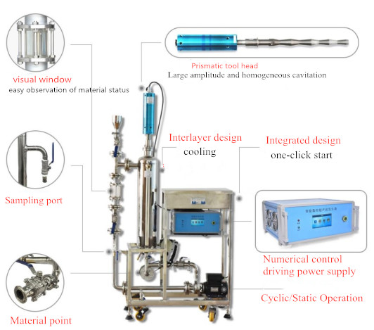 This series combines all the handling, R&D and testing projects of ultrasonic liquid, including the effective combination of ultrasonic driving power supply, stainless steel reactor and flow control system. which can efficiently handle more than 5 liters of samples. With peristaltic pump, temperature detection and pressure detection, the flow direction and velocity can be better controlled, the field working conditions can be simulated, the operation of monitoring system and data collection can be carried out, and the solid-liquid mixing feeder specially equipped for dry powder can be selected. The results obtained by this system can be easily copied to industrial production lines.